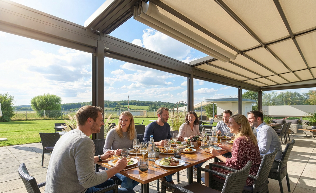 With a retractable roof and optional side elements, a single area can serve multiple purposes throughout the day. Open the roof fully for open‑air dining when conditions are ideal, partially extend for late‑afternoon sun, then close and lower side screens or glass walls for evening service, private events or poor weather.