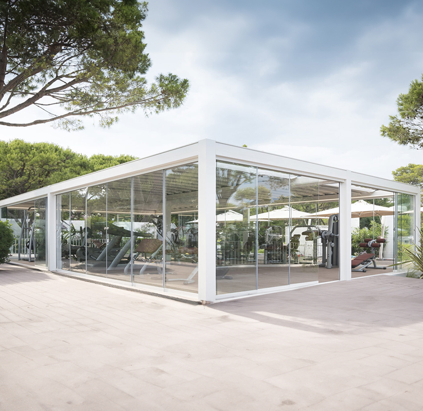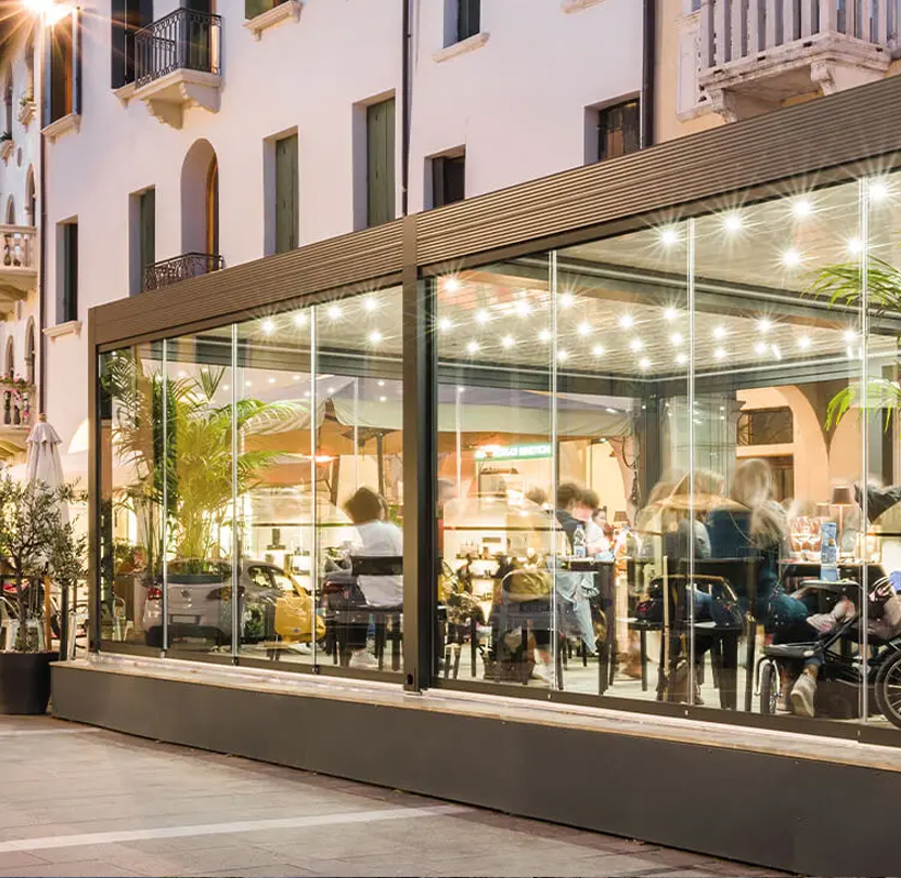 Side infills are offered with sliding glass door options, vertical electric blinds and fixed and louvered aluminium walling.