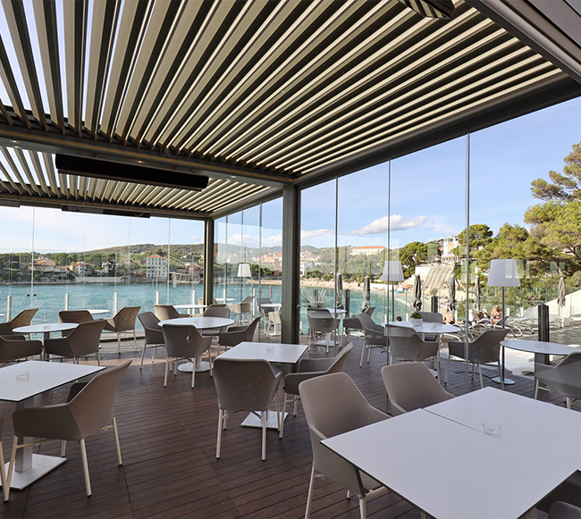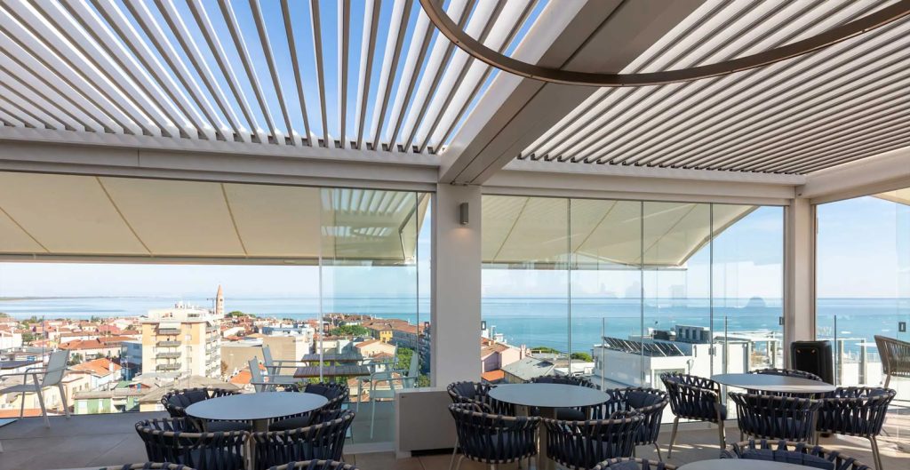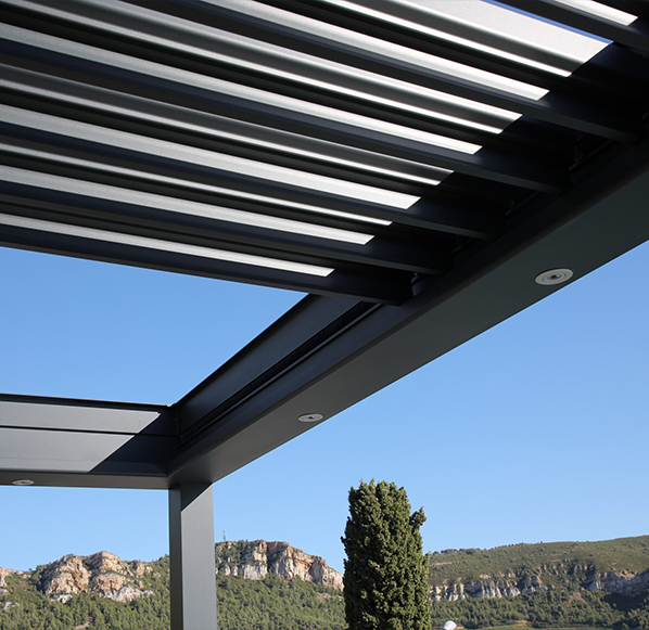 Roof sections with full retractable fabric options in either standard awning fabrics or tougher vinyl triple layer fabrics which offer a stronger final protection when fully extended and in use. Rotating aluminium louvre blade systems offer great sun protection and control of air flow and light with options for a retractable louvre blade roof for maximum weather control.