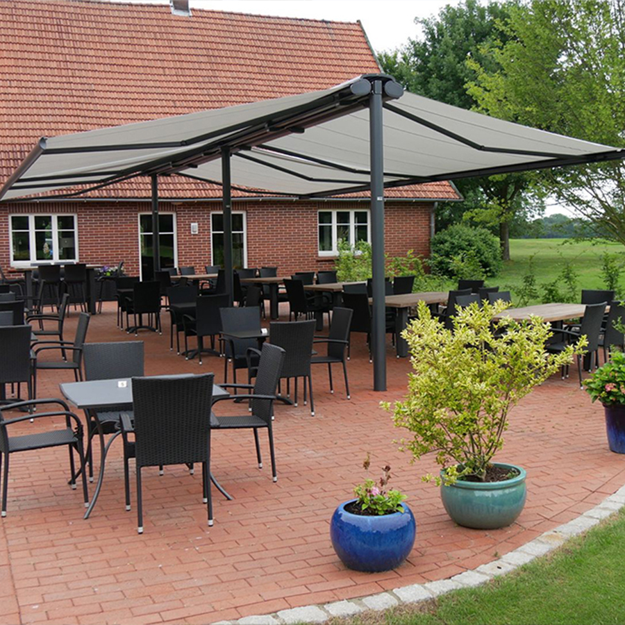 The largest single size for our Syncra system is 7m wide and fitted with two awnings, each at 4m projection you now have a covered space of 56 square metres. However, you can couple the system and line up for far larger area coverage if required. The awnings retract completely to leave a clean goalpost structure when not in use. This structure can be fitted with LED lighting and infra-red heating to provide lighting and warmth in the evenings and cooler months of the year.
