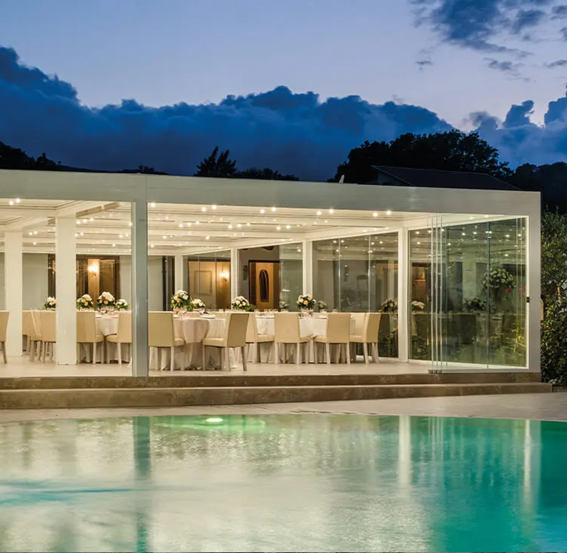 Samson offer a wide range of various self-supporting structures which have a flat roof design and are capable of being a modular structure with many options to enclose further when and if required. Self-supporting and with various retractable roof options, these structures provide all year-round protection from sun, wind and rain when specified correctly. As an ‘outdoor room’ there cannot be 100% wind and rain ingress protection, but more than enough to deal with 99% of the weather conditions during a normal year.
