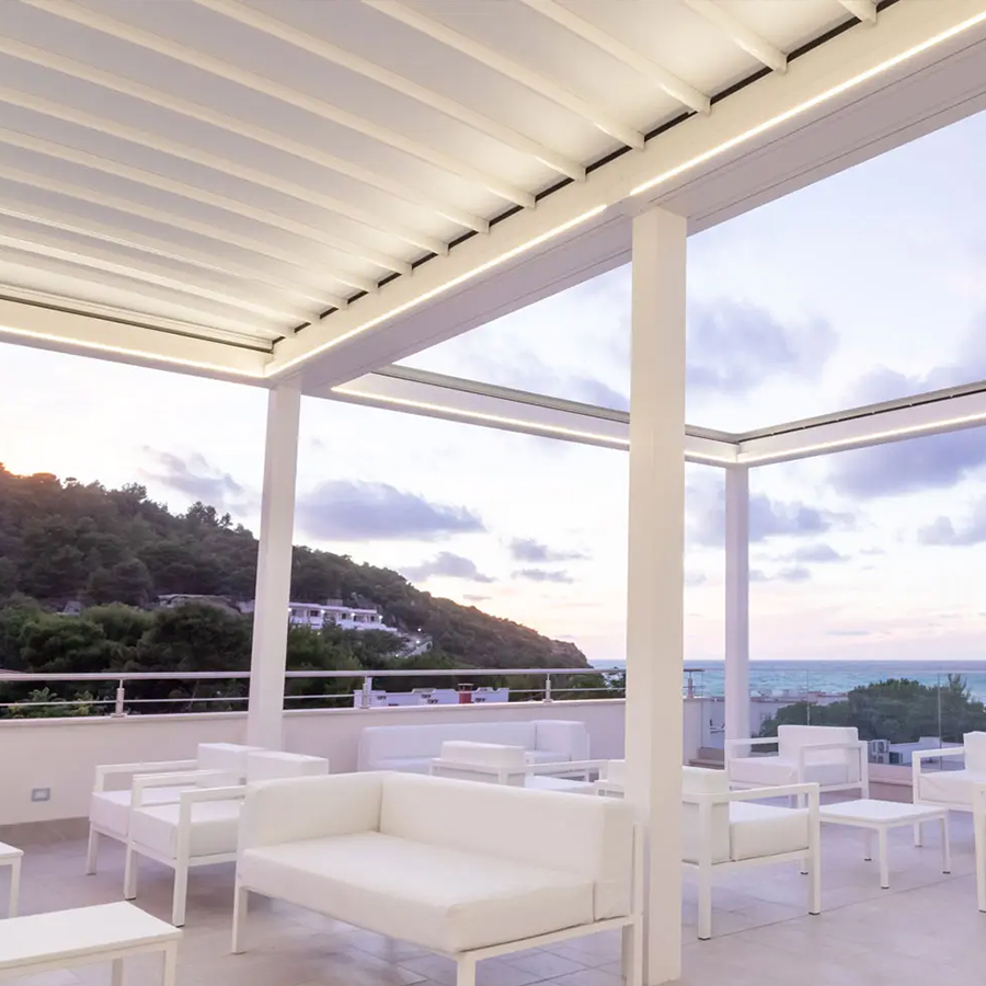 All the systems we offer are bespoke sizes and always have electric operated aluminium blades. LED lighting and infra red heating systems are very popular for evening use.