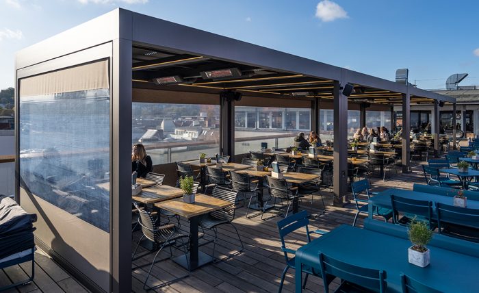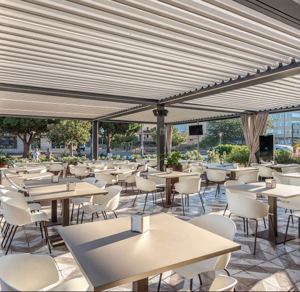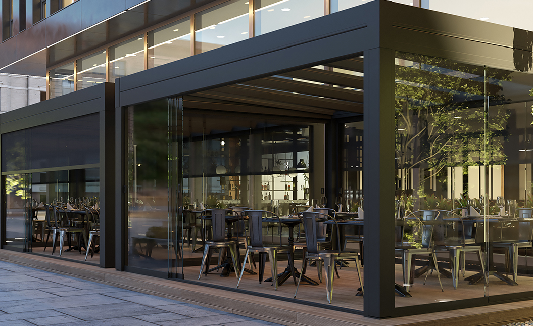 Samson Awnings provide bespoke commercial solutions with retractable fabric canopies, fixed glass and polycarbonate roof systems, and rotating louvre blades. All these are incorporated into what is often referred to as a ‘pergola’ but the reality of many structures is far more varied and they are nearly always manufactured from aluminium profiles, giving the best flexibility in design, strength and longevity.