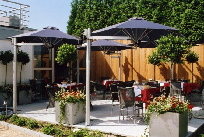 The Paraflex multi-system can mount up to a maximum of 5 parasols on a single centre support pole. This allows for minimal ground space but offers maximum shading ideal for areas which require floor space e.g. dining areas, decking.