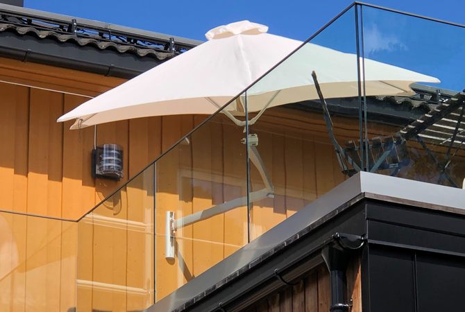 Umbrosa Paraflex side supported umbrellas provide the ideal solution. Create shade wherever you want, in the right spot at the right time, and just the right amount. It has a unique and patented system removing the need for a heavy base and central pole support. One attachment can be to the wall or to an aluminium pole.