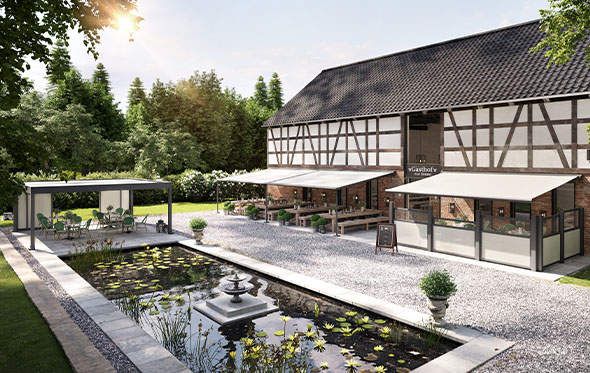 Our Outdoor Living team welcome you to visit our comprehensive showroom which is one of the largest in the UK, since 1992 at the same location. We have inside and outside working models of awnings, pergolas, glass verandas, retractable canopies and umbrellas. We also have a large range of entrance and garage doors as we are part of the Dovegroup and have doors, security products and electric gates in our portfolio. Our range of products that you can use for yourself and relish in the joy of outdoor living are from our trusted, impressive manufacturers such as Markilux and Weinor.