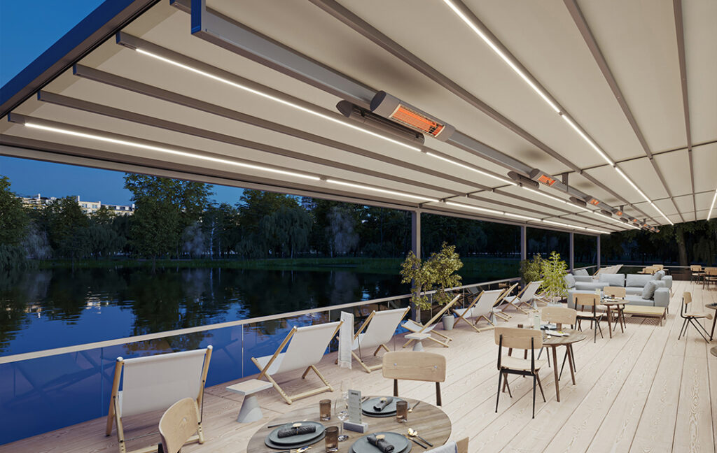 The usual trick to keep customers comfortable outside, when the weather has turned slightly, in the early and later summer months, is to protect from rainfall, but also protect from the effects of cooling winds. Retractable and fixed sides to many of our outdoor systems can be retrofitted or built in at the point of installation. With sunshine protection it is often a 50/50 split, with people who want to sit in the sun when eating and drinking, and those who want to keep out of it, but do enjoy the warmth and natural light. Of course many of our systems can also incorporate lighting and heating so you can extend the evenings too with your customers.
