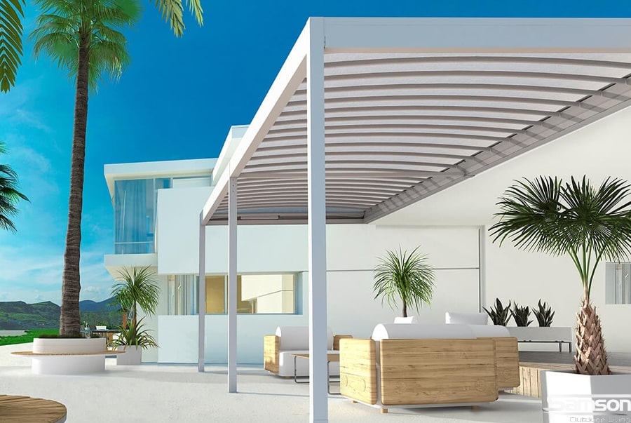 We specialise in retractable aluminium pergola type structures, having been one of the early sellers of these systems from Northern European manufacturers when they first developed in around 2009 in the UK. In terms of wind resistance and the ability to retract in the wintertime or very bad weather, these systems offer the best in protection from sun and rain, but also have high wind resistance.