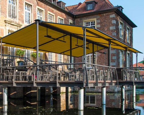 Many systems are now available where the main structure uses a flat roof design but the fixed or retractable roof internally is on a slope for rainwater drainage. Many commercial properties often lack the fixing height for a sloping traditional system and many modern buildings need the flat roof design to look right. A good deal of our retractable awning systems have a great deal of choice when it comes to design and some of the framework systems are also important in the overall look and feel as well as performance.
