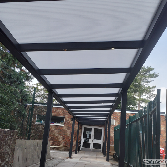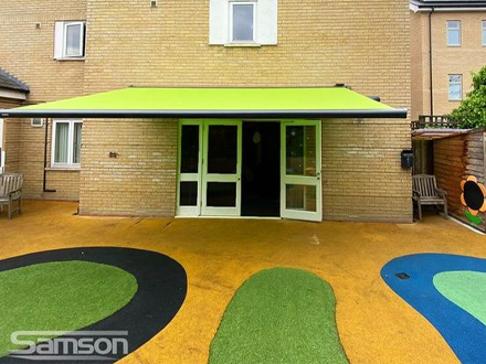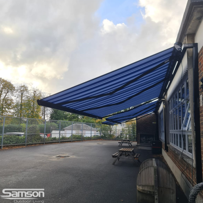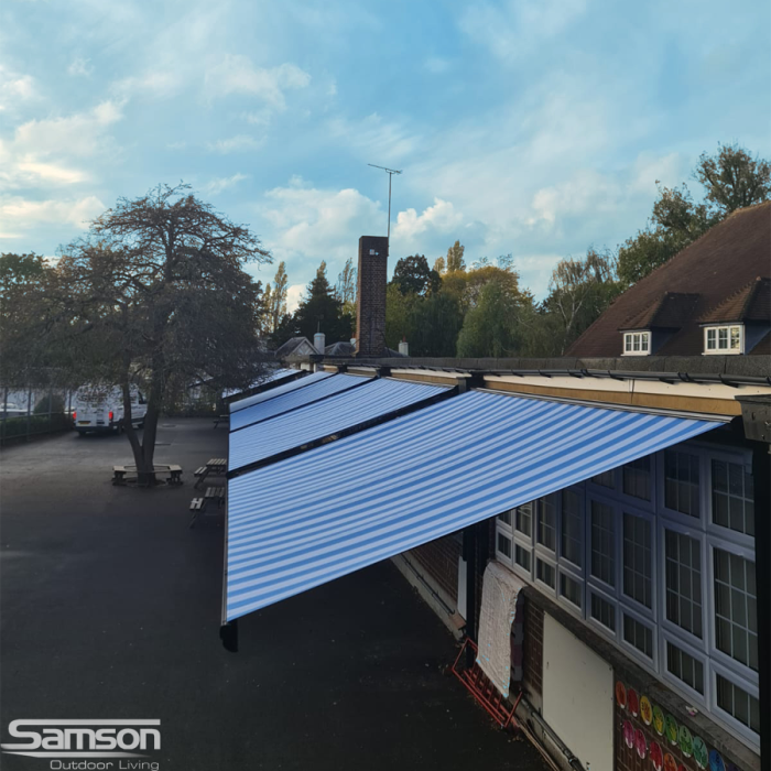 Sun shading outdoor areas in various shapes and sizes have become increasingly popular in nurseries, schools and universities, and other educational facilities to provide effective sun, UV and rain protection for pupils, staff and parents. Creating additional space outdoors has so many obvious benefits for health and well being. Samson Awnings offer several solutions, in either manual or electrically operated models. The ease of operation and cost effectiveness is also appealing to most and with some careful planning can provide an attractive, practical, healthy, additional outside area for most of the year round use.
