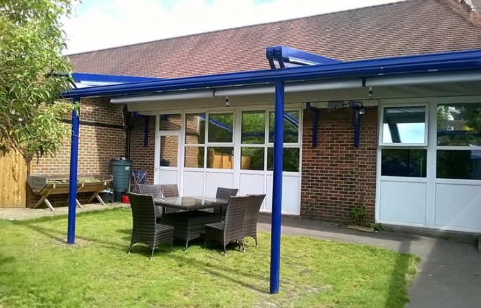 A very popular choice for many schools and nurseries over the years has been a retractable awning, either mounted directly onto a building wall or also fitted to a goalpost framework to then have 2 or more awnings to cover larger spaces.