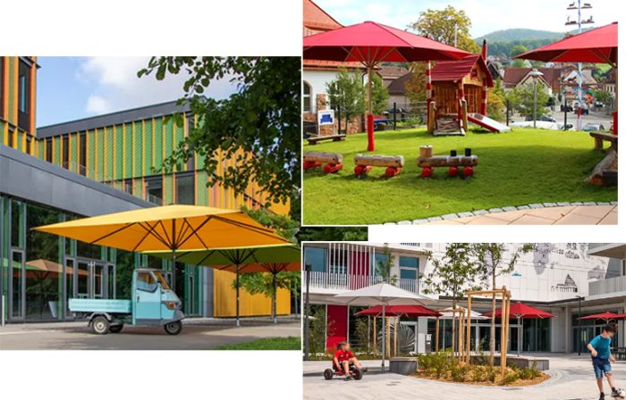 Very popular for covering smaller to medium spaces in schools are out commercial parasols (or umbrellas, we are never sure what to call them really) and they can be a great solution for any area where the space is only required for use infrequently.
