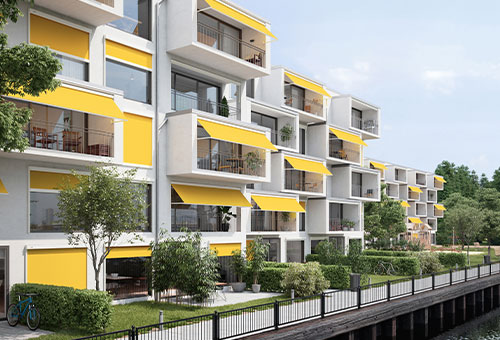 Choose from either oblong, square or round cassette shapes for the curtain roll housing and various shaped channels, guides and brackets for the installation and structural surrounding integration. The fabric curtain is guided vertically using either cables, stainless steel rods or the ‘zip’ system which is the most stable and weather proof system having the fabric actually zipped into the side channels, so no light, wind or rain can get past.