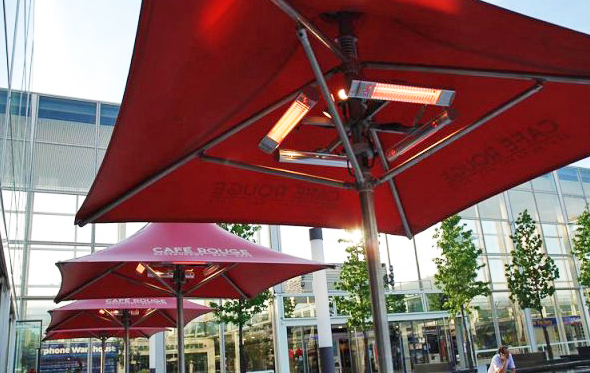 Highly efficient heating and lighting systems are readily available for the Vortex parasols range providing comfort and creating theperfect ambience at night. A custom made hub system specially designed for Vortex enables the connection of up to 4 efficient halogen heaters with minimal of fuss. Standard heaters are 1.5Kw electric infrared with integrated switching.