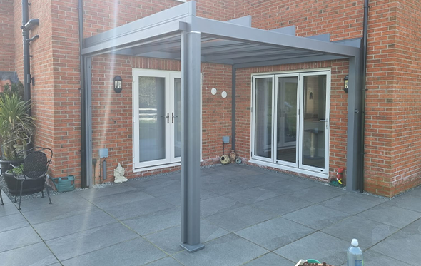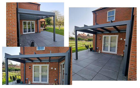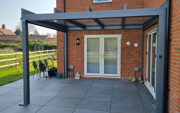 This corner installation of an aluminium ‘Pure’ structure gives a fantastic visual finish but also includes a hi tension zip electric vertical blind to provide shade and wind/rain protection when required. With the 2 sets of doors from the house this really does act like a veranda in its functionality and provides protection for both sets of doors, even when open in the summer rain. This private property in London now benefits from simple, robust and purposeful additional living space, to be used most of the year round and adding extra protection to enable the existing doors to stay open far more too. The Pure is one of the cleanest looking glass canopies we offer in terms of visual appearance and even with the sides enclosed there is no need for additional glass or material above the openings as required on angled structures… The sparkling iron metallic paint textured finish is a popular choice and one of the most durable paint finishes for any aluminum outdoor structures.