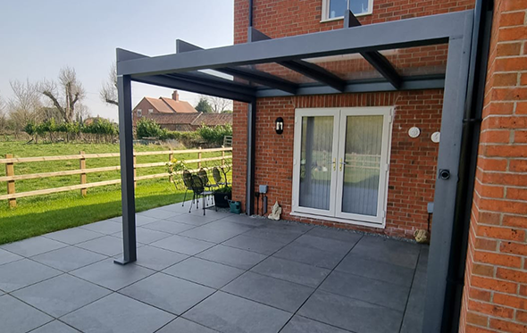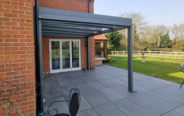 Another one of the newer, flat roof ‘Pure’ glass verandas we offer for the best aesthetics. With an electric vertical zip blind on the side most exposed to wind and weather this veranda has the versatility to be fully open or semi closed up, depending on the weather.