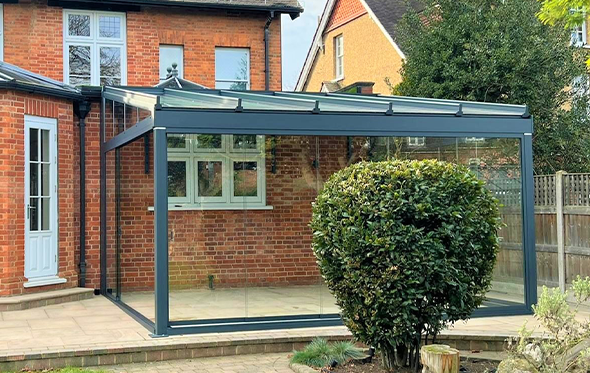 An absolute classic glass outdoor room, utilising sliding glass doors on 3 sides and providing a very high quality space for entertaining and relaxing most of the year round with sun protection from the retractable underglass blind when required and full air flow from opening the doors fully. This glass room, installed in London by Samson Outdoor Living, demonstrates a very popular size, but also one of the best specifications in terms of the sliding glass doors all round and the electric built in retractable roof awning for sun protection when required. So many people think a glass room might be a problem in the summer and they will fry inside, but this simply isn’t the case because with every glass room we design the sides are always able to be opened fully to allow full air circulation. The glass roof above your head doesn’t amplify the sun or heat, in fact is filters out most of the harmful UV rays. What you do with a glass veranda or room is define an outdoor space and create somewhere to spend a lot more time when at home. With some simple thought you can have a glass veranda canopy with various options for the open sides to be closed up when required but as in this example also have a built in underglass retractable awning. This electric awning will give you full control of the sunlight and heat in the hotter summer months. This particular glass room is approximately 5m wide and 3.7m deep and being a wall mounted system, it has the fixed glass trapezium sections above the sliding glass doors and is the more recent ‘Sempra’ model with the cleaner roof bar design and only 2 front posts for the cleanest aesthetics and practical operation. The highest quality and strongest aluminium framework provide complete peace of mind in terms of integrity, with high standard snow load levels, but also longevity, especially with the enhanced textured paintwork finish, designed to resist scratching and fading over the years. The glass sliding doors and the roof glass is all 10mm and safety specified clear glazing. The sliding glass doors are almost 1 metre wide each and sliding to one side and to the rear at either side. Rainwater is collected in the built in gutter on the front profile and directed down the front posts to low level where it is projected out and away from the room area. This outdoor room will be used for more than can be imagined throughout the year and when it rains it is a delight to sit outside and simply listen and watch the rain falling in.