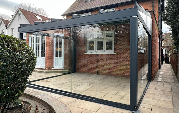 An absolute classic glass outdoor room, utilising sliding glass doors on 3 sides and providing a very high quality space for entertaining and relaxing most of the year round with sun protection from the retractable underglass blind when required and full air flow from opening the doors fully. This glass room, installed in London by Samson Outdoor Living, demonstrates a very popular size, but also one of the best specifications in terms of the sliding glass doors all round and the electric built in retractable roof awning for sun protection when required. So many people think a glass room might be a problem in the summer and they will fry inside, but this simply isn’t the case because with every glass room we design the sides are always able to be opened fully to allow full air circulation. The glass roof above your head doesn’t amplify the sun or heat, in fact is filters out most of the harmful UV rays. What you do with a glass veranda or room is define an outdoor space and create somewhere to spend a lot more time when at home. With some simple thought you can have a glass veranda canopy with various options for the open sides to be closed up when required but as in this example also have a built in underglass retractable awning. This electric awning will give you full control of the sunlight and heat in the hotter summer months. This particular glass room is approximately 5m wide and 3.7m deep and being a wall mounted system, it has the fixed glass trapezium sections above the sliding glass doors and is the more recent ‘Sempra’ model with the cleaner roof bar design and only 2 front posts for the cleanest aesthetics and practical operation. The highest quality and strongest aluminium framework provide complete peace of mind in terms of integrity, with high standard snow load levels, but also longevity, especially with the enhanced textured paintwork finish, designed to resist scratching and fading over the years. The glass sliding doors and the roof glass is all 10mm and safety specified clear glazing. The sliding glass doors are almost 1 metre wide each and sliding to one side and to the rear at either side. Rainwater is collected in the built in gutter on the front profile and directed down the front posts to low level where it is projected out and away from the room area. This outdoor room will be used for more than can be imagined throughout the year and when it rains it is a delight to sit outside and simply listen and watch the rain falling in.