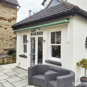 After a showroom visit, the customer was happy with the Markilux MX3 retractable awning choice. Renowned for its sleek design and versatility, the Markilux MX3 offers a full cassette awning system, providing optimal protection for the fabric when retracted. Choosing the MX3 allows them to select a range of colour choices and the unique styling panel, which harmonises with their current surrounding design. Manufactured in Germany, the Markilux MX3 offers durability and stability with a wind resistance rating of up to 20mph (Beaufort 5), which is safe even in moderately windy conditions. The awning was made to measure to fit the customer’s outdoor space, with dimensions of 4400mm x 3500mm. To ensure added safety and protection, a Vibrabox Wind Sensor is integrated into the system, automatically retracting the awning in response to strong winds. This awning is also equipped with Somfy Operation, featuring a 1 CH remote and a left-hand motor for seamless control and convenience. Due to the surrounding design, our customer chose an anthracite grey framework with a vibrant green 6018, adding a touch of modern elegance to the outdoor space. With the Markilux fabric, you can get the advantage of water-resistant and self cleaning fabrics as long as the UV protection is up to UPF 50+ rating. To extend outdoor comfort during colder evenings, an Evergreen heater was added, providing warmth and ambiance for extended outdoor enjoyment.