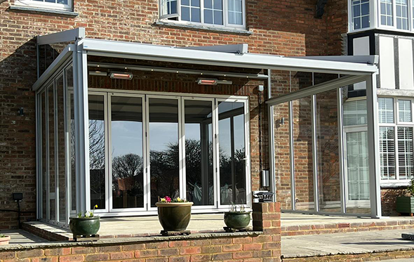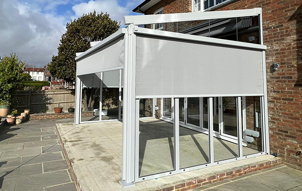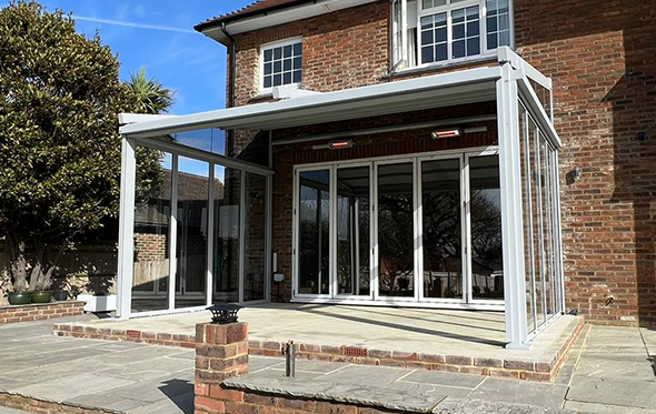 This particular system fitted by Samson Outdoor Living in East Sussex is 5000mm wide with a 3500mm projection ad is fitted with fixed side glazing but also 3 remote controlled electric vertical zip blinds. A zip blind is an electric fabric blind designed for external use and has far higher wind ratings than any other blind, with the fabric zipped in at either side to provide side tension as well as the vertical tension. Adjust all day long to control light and heat, but also privacy at night. This particular installation also incorporated LED lighting and 2 infra-red heaters, all controlled via the handheld transmitters provided. The customer already provided the concrete base, raised from the patio area and to provide seamless entry and exit from the main house via the existing patio doors. What a superb outdoor space for pretty much all year round living!!