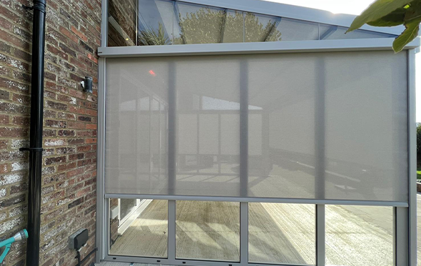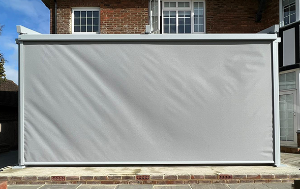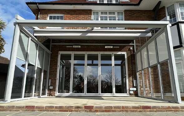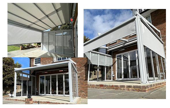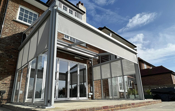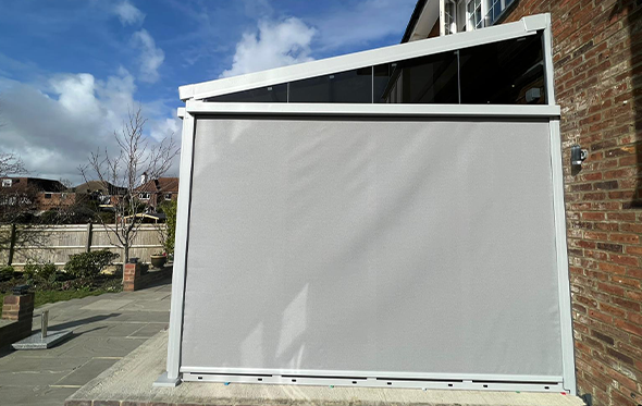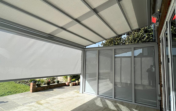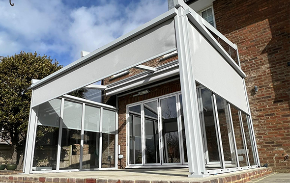 Fully retractable fabric roof with the capability of taking the heaviest of rainfall and draining it all away from the outdoor area. The fixed glass side and vertical blinds give further protection from wind and rain all year round.