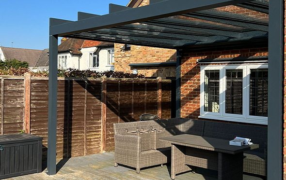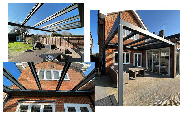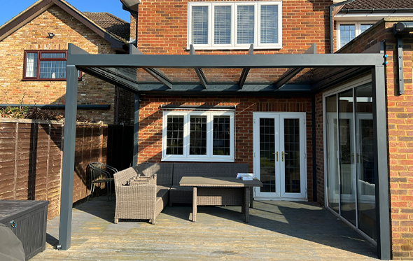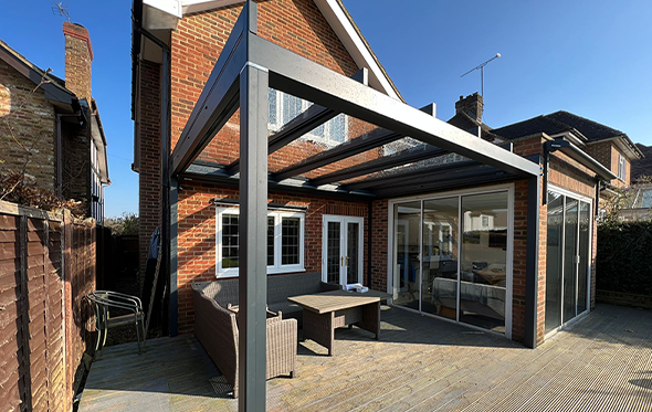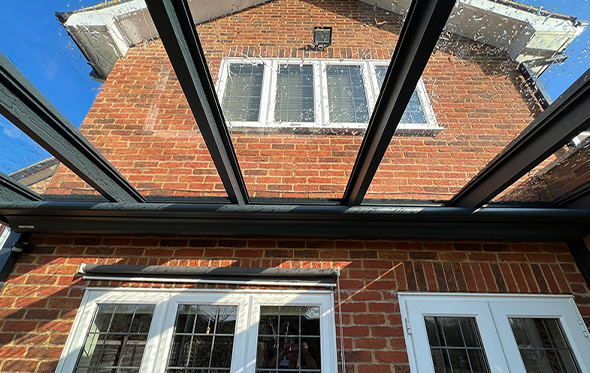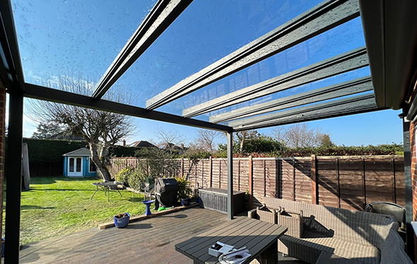 The flat glass roof solution to co-ordinate with other flat roof buildings or create a super stylish look. Protection from rain and sun in one.
