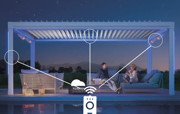 In another context it is fully possible to connect your new electric bioclimatic pergola system and all its accessories to a smart home system, whether that be a Somfy system or one of our other brands depending on pergola choice. You can then control your outdoor system from literally anywhere with your smart phone or tablet.