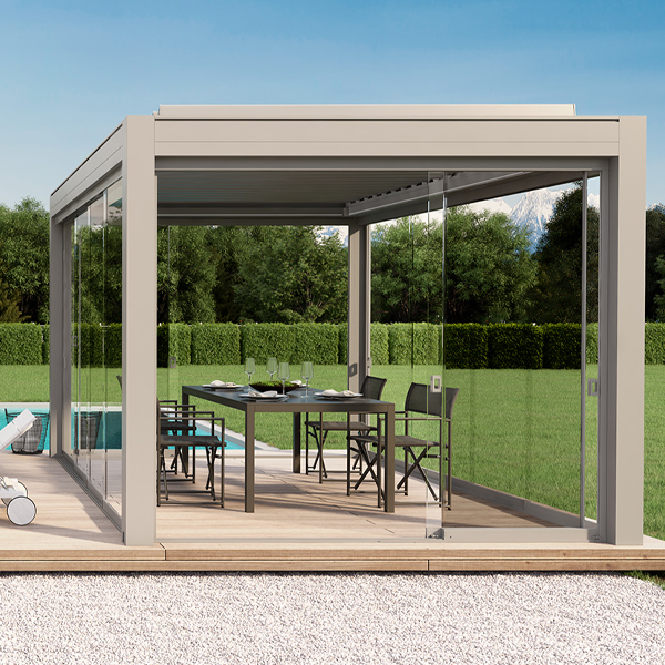 Aluminium structure, aluminium tilting roof blades and optional side infills – glass walling, louvre walling, fabric blinds and solid wall options.