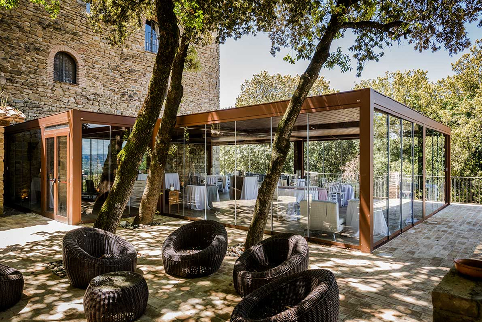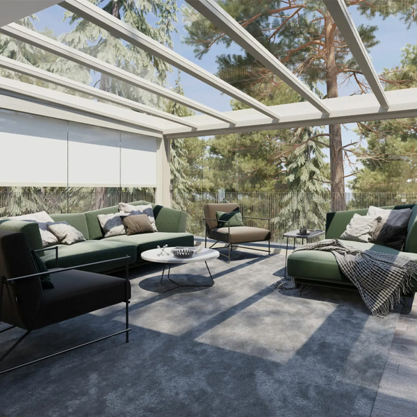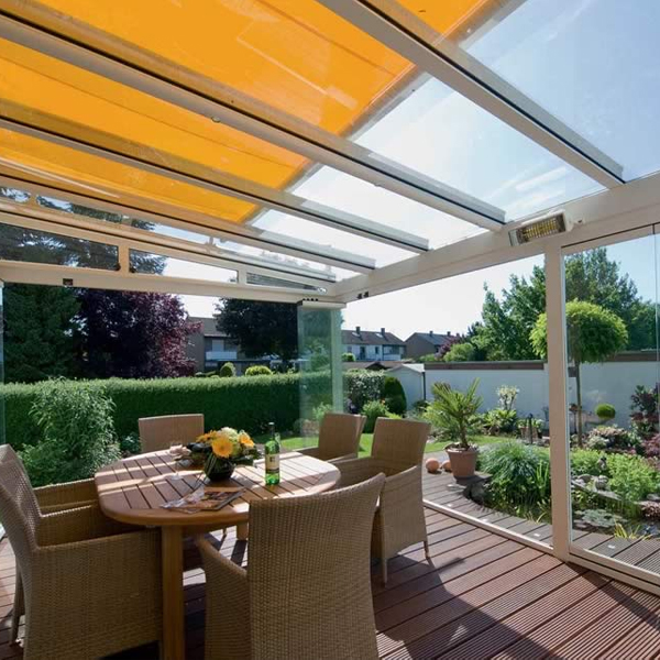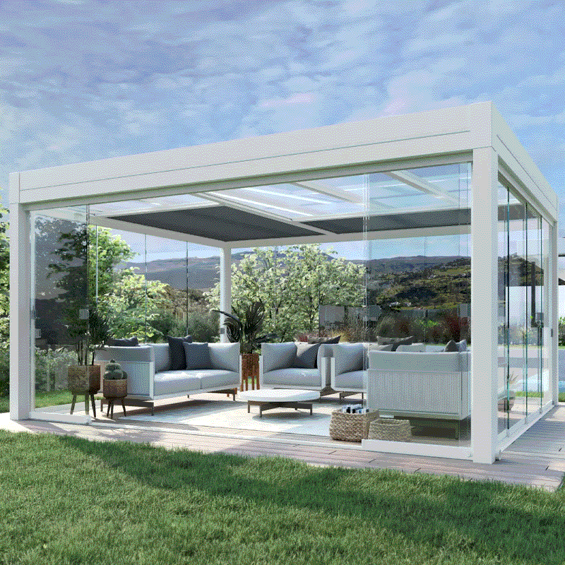 For a retractable pergola roof system and still with full panoramic vision look at our Pergotex or Isola systems. Retractable and fully waterproof fabric/vinyl roof offering complete UV protection, but options for fabrics with light passing through. Combine this system with the same sliding glass walls and other weather protection products and you can have a ‘cabriolet’ roof.Simple push of a remote handset button and the electric roof can retract to open up the sky to you. Glass doors will still prevent the wind of course and on the hottest days open up the whole system for enjoy.