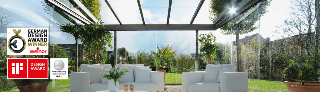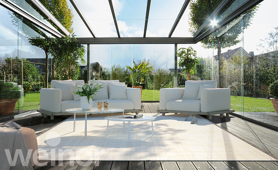 A glass garden room should ideally offer sheltered protection all year round, yet remain fully interactive with the outdoors thanks to its innovative clear glass elements, doors and blinds.