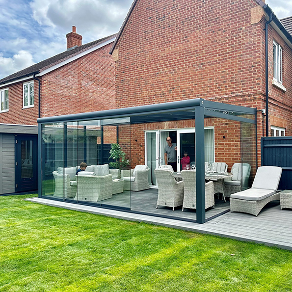 Whether installed on a house, old or new, a garden glassroom from Samson Awnings will become both an architectural highlight and a frequently used extension of your home. Unlike your average conservatory, the construction work required as part of the installation is minimal, meaning a faster installation time. No foundation work is usually required and no alterations to your home are usually required either. Most of the time, you won’t even need to apply for planning permission! Many customers prefer an outdoor room on a raised concrete or decked area and this does help a lot with unlevel patios as well as coping with excessive rainwater in a storm.