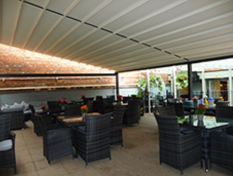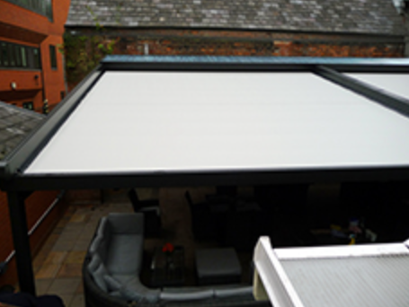 The technically-advanced robust fabric cover neatly unfolds and is guided down side channels to produce a covered area that constantly provides a feeling of warmth even on the coolest of days, acting almost like a normal plastered white ceiling
