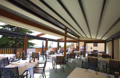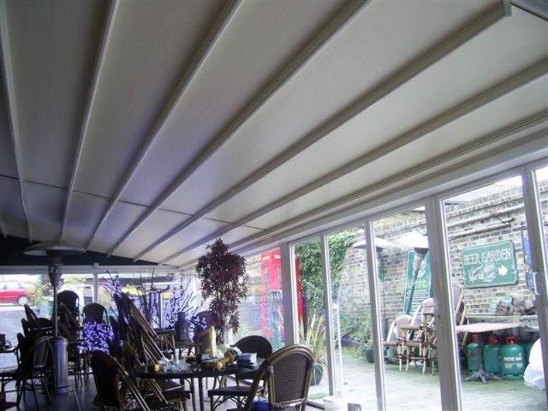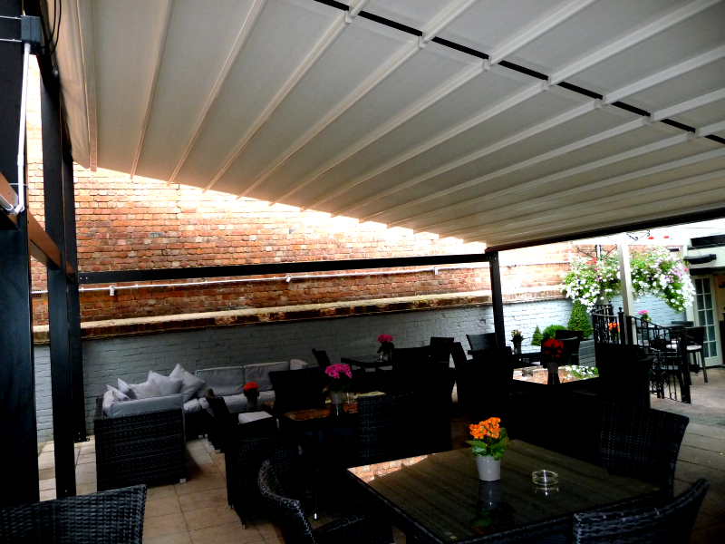 The technically-advanced robust fabric cover neatly unfolds and is guided down side channels to produce a covered area that constantly provides a feeling of warmth even on the coolest of days, acting almost like a normal plastered white ceiling