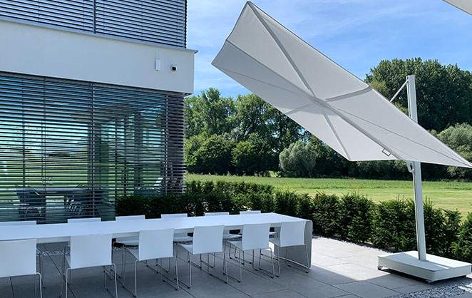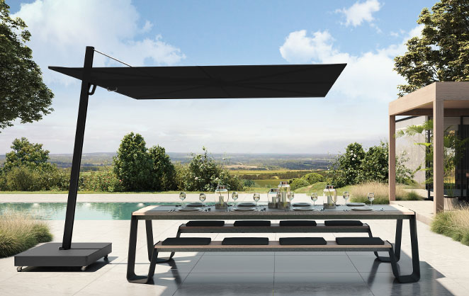 The Spectra UX Architecture Full Black is so much more than a black umbrella. The new version is based on the Spectra UX Architecture and has the same functionalities. The Full Black not only matches well with black outdoor furniture and accessories, it also adds a modern touch to green environments with lots of wood and warm elements. The cantilever 3x3m umbrella can be subtle & discreet and at the same time shine in any outdoor environment!