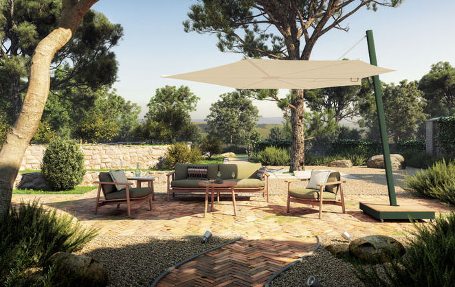 Our stressful world enhances the need to ‘connect’ with nature and that is exactly what our nature umbrella does. The combination of the ‘linen’ Sunbrella fabric with the green frame and wooden base plate create an instant feeling of ‘de-stressing’. The NATURE umbrella is a perfect addition to the contemporary outdoor furniture in which wood plays an important role. Nature is the parasol that stands out the most thanks to its design that goes back to its name and inspiration. Based on recurring earthy tones and wood textures, it fits perfectly into unspoiled green environments. The consumer who is seeking harmony, balance, relaxation and mindfulness will become happy from this umbrella.