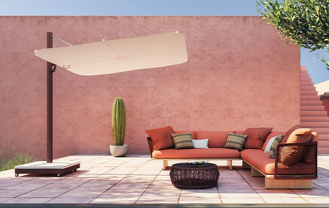 Ethnic influences play an increasing role in the outdoor scene. Colours and playful shapes are not only used for accessories. The Culture umbrella with its brownish red and pink shades is the most colourful umbrella of this collection. It is a showstopper and eye-catcher for the creative daredevils amongst us. By extending the form element of the rounded corners of the base to the canvas, and reusing the fabric of the canvas around the base, we create not only simplicity but also playfulness within the product. This allows the location to vary from a trendy rooftop bar to a down to earth small resort. Anything is possible!