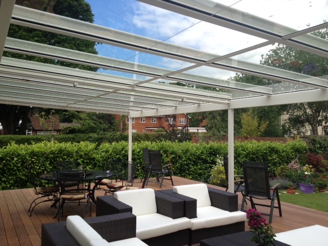 The glass veranda systems we offer provide the most light and clear vision of any product and enable small, medium or large areas to be covered and used all year round. The glass veranda will be less noisy in heavy rain than polycarbonate but glass if heavier so the structures have to accommodate this in the design and support sections.