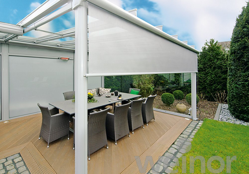 It is quite usual to infill at least one side of a canopy when reasonably exposed in a terrace or patio area to help prevent the prevailing wind and the cooling effect this will have. Of course, it also prevents sideways rain driving under the roof when combined with the wind and may also be used for increased privacy, comfort and protection.