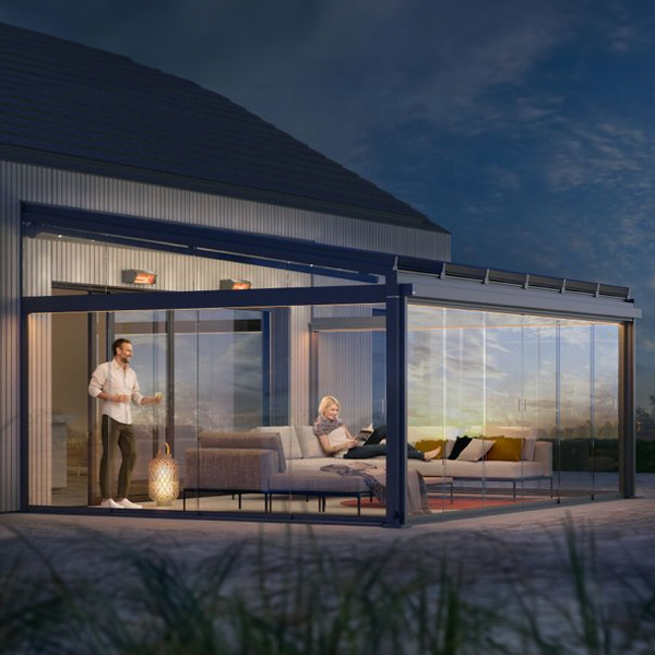 Additional infrared halogen heating and LED lighting can all be incorporated to provide more use at night and in cooler weather. Integral fabric blinds can be fitted on top of or underneath the glass roof to control intense sunshine in the hottest months.