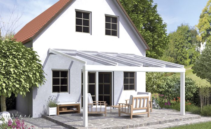 Most polycarbonate roof systems are used for either covering areas in and around gardens and patios or for car ports. They are an easy addition of covered space providing rain protection all year round. Most simple ‘lean to’ roof systems only need a wall plate fixing and then the correct number of support posts to hold the roof beams and polycarbonate inserts.