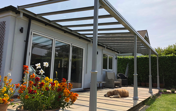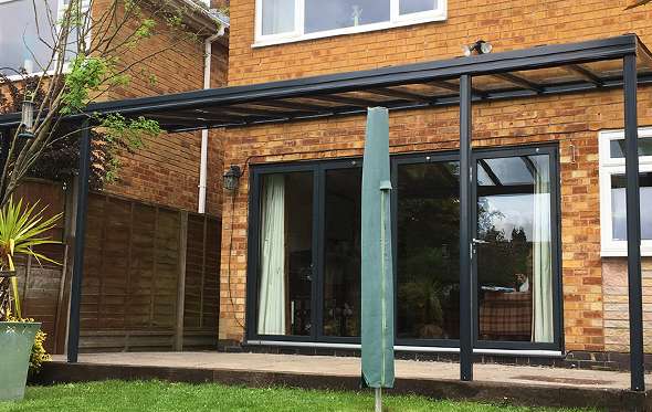 Generally for our UK weather, a fixed roof structure on a framework is the only true way to have all year round protection from our ever increasingly diverse climate. All of our fixed roof canopies and verandas are made from aluminium with either a polycarbonate or toughened glass roof.