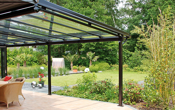 The glass veranda systems we offer provide the most light and clear vision of any product and enable small, medium or large areas to be covered and used all year round. The glass veranda will be less noisy in heavy rain than polycarbonate but glass if heavier so the structures have to accommodate this in the design and support sections.