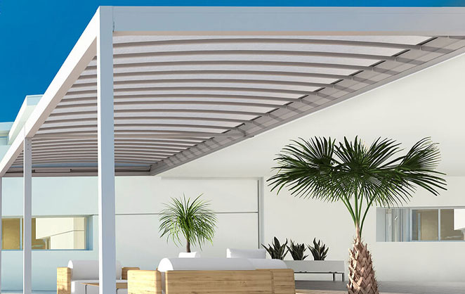 The QUBE Arc aluminium pergola protects you from sun, wind and humidity. Thanks to the movable covering, a new concealed system to collect and drain rainwater makes the pergola very efficient, even in very heavy rain.