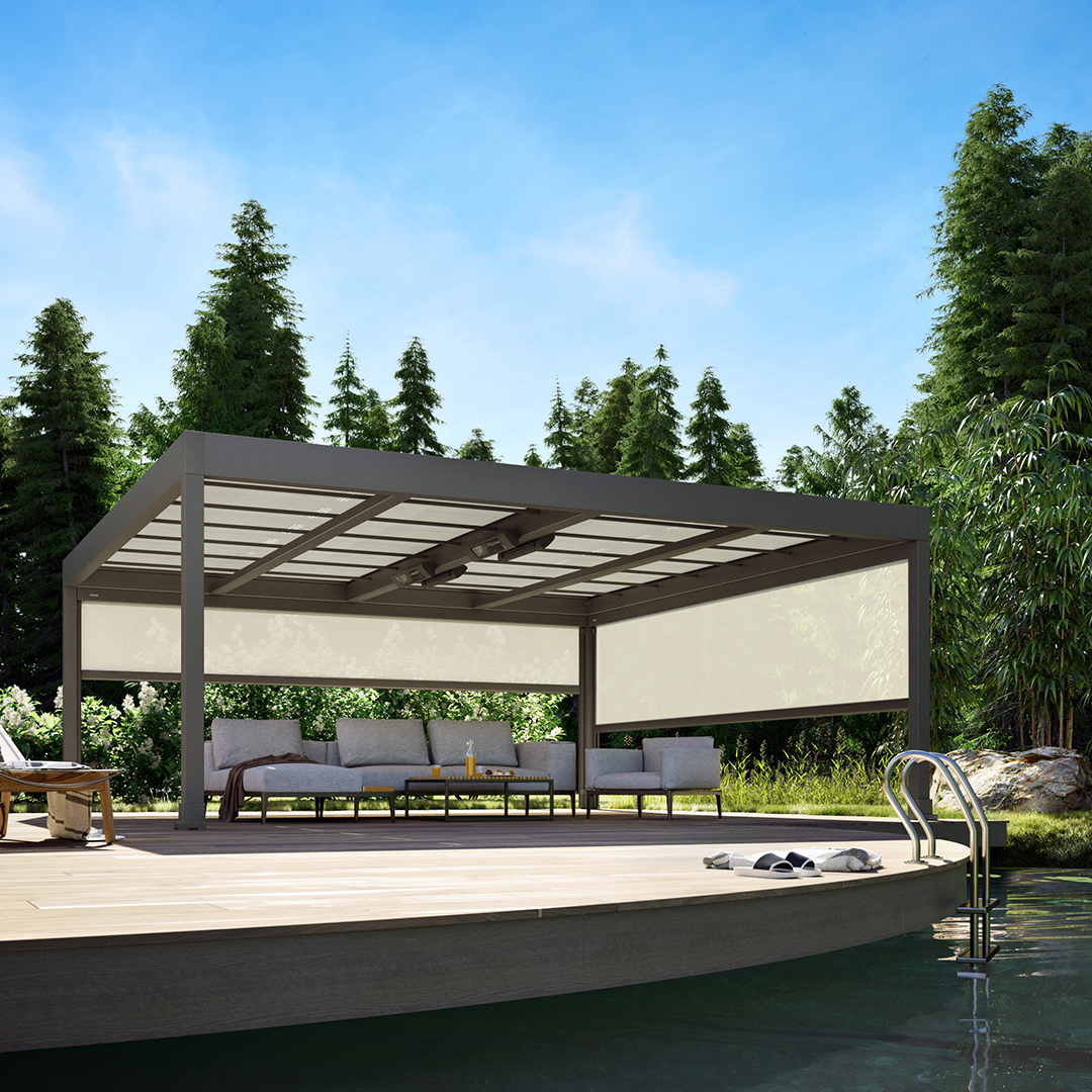 Pergolas are outdoor structures with a roof and supporting posts that can be bespoke to suit various styles and house designs. Moreover, if you opted for high quality pergolas like Markilux or Weinor, the pergolas can even be resistant to wind speeds of up to 30mph and safe to use when it rains. Since pergola are largely open, they are one of our recommended products to block a neighbour’s view because they can be adapted to include stat walls and stylish, secluded seating.