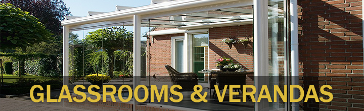 Front and rear supported glass veranda with aluminium framework and built in rainwater guttering in front profile section with electric operated retractable fabric blind for control of light and heat.