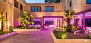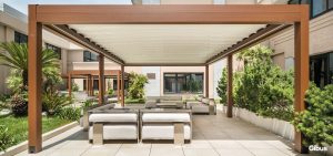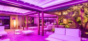This is an example of a fantastic commercial Gibus Med Zenit installation.Hotel de la Ville is a popular modern hotel in Central-Southern Italy, that is especially popular amongst commercial guests. It is known as one of the most popular conference centres in the local area, and because of this, the hotel wanted to turn their outside space into somewhere that could be used all year round.They decided they wanted stand alone fabric roof systems, for their ability to protect from both scorching heat and rain, as well as open up when appropriate. After deliberation, the new Gibus Med Zenit system was chosen.Alongside the similar Med Azimut, the Gibus Med Zenit takes the world-beating idea of the Med Room system, and improves on it both aesthetically and technically. The main difference is a curved fabric roof, as opposed to the Med room’s flat but sloped roof. This enables the system’s aluminium frame to have a much smaller top profile, as the lack of slope on the roof means less height is needed. This not only makes the system look sleeker, but also makes it look far better when used with single story buildings.The curved roof is made of a PVC fabric that is both waterproof and highly UV resistant, protecting the area below and its inhabitants from rain, hail, and even scorching sun. The fabric’s shape is kept via horizontal beams that run along it, and this allows the fabric to keep it’s shape, directing water down the sides and into the anti-splash guttering, which runs around the frame and down the legs, allowing water to exit at ground level. LED strip lighting was chosen to run around the frame, and they used the almost limitless RGB colours to create a truly stunning area for relaxation and socialisation later at night.Click here for more information on the Gibus Med Zenit and Azimut, click here>Get a quote >