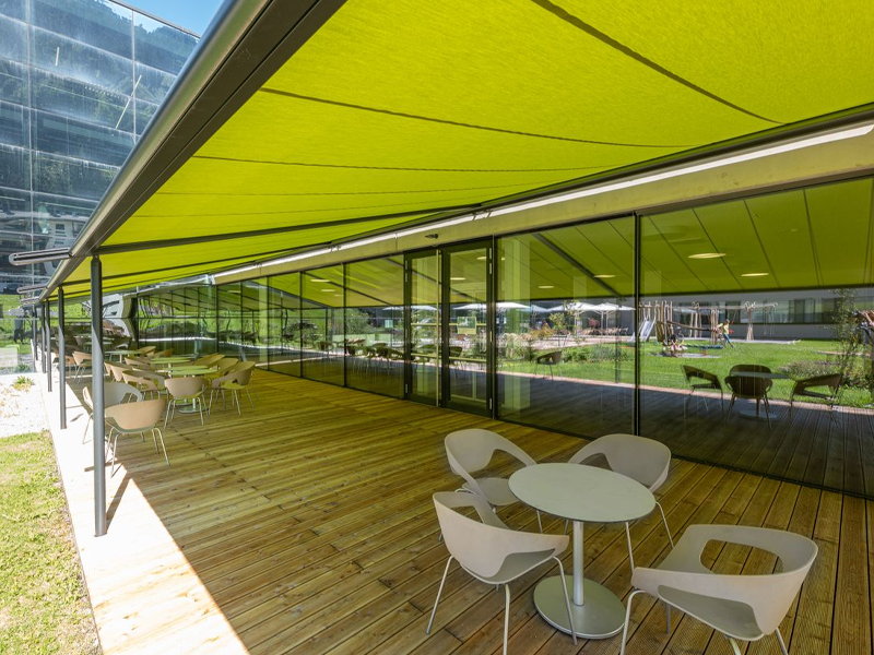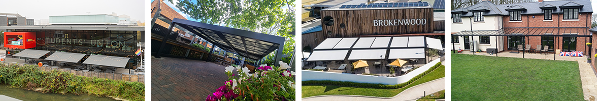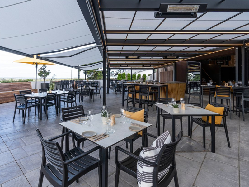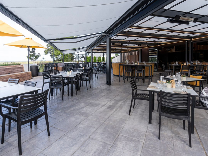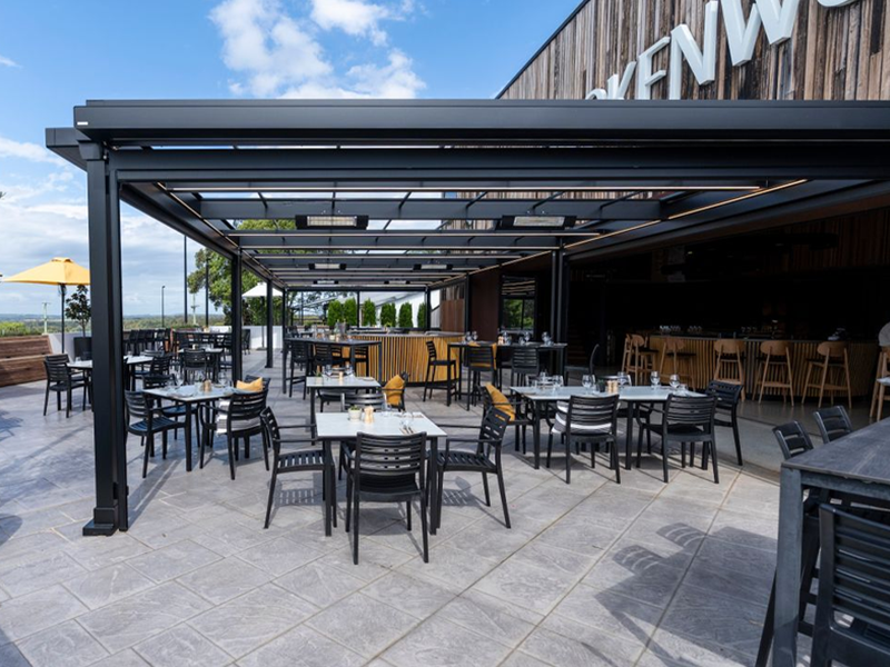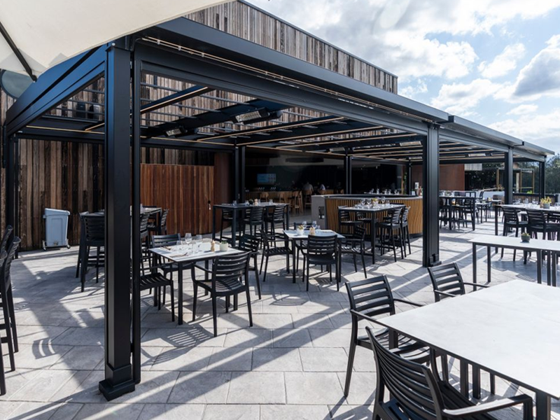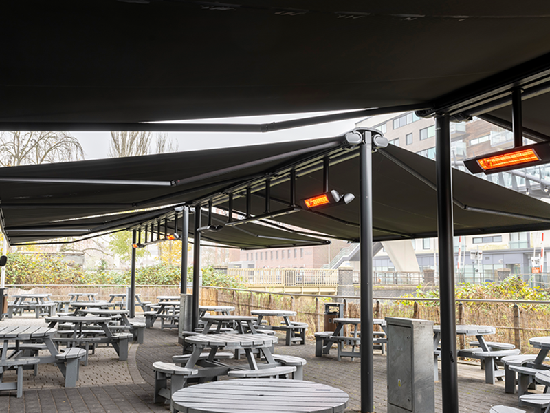 Multiple Markilux Pergola Classic’s with adjustable front supports, allowing rainwater to drain off better, so that the sunshade also becomes a shelter during light rainfall. Sunvas Perla Flame Resistant and Waterproof fabric meeting fire protection regulations for public buildings.