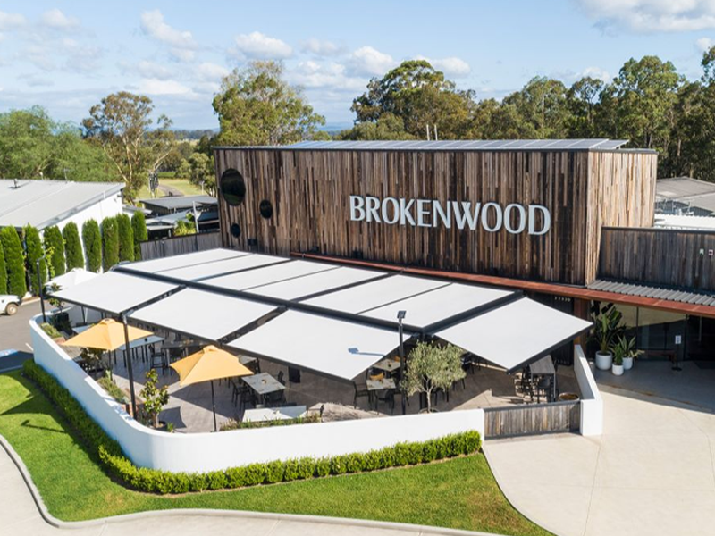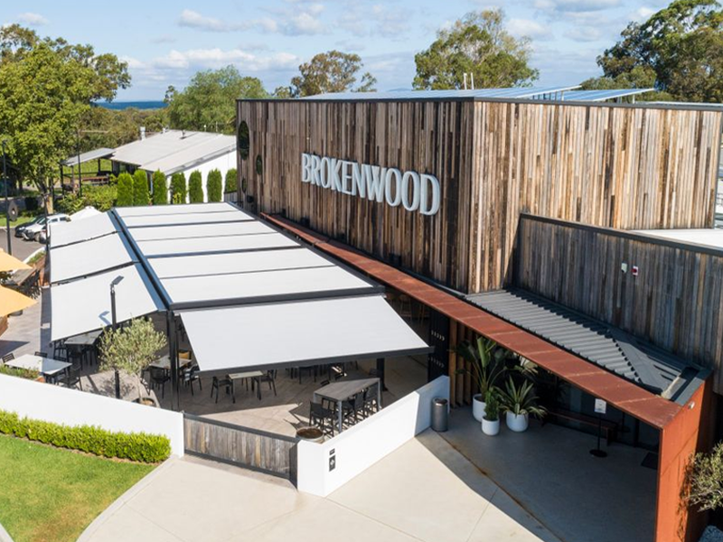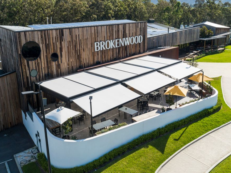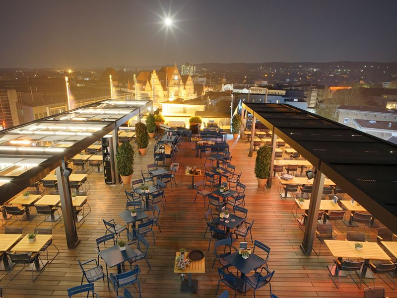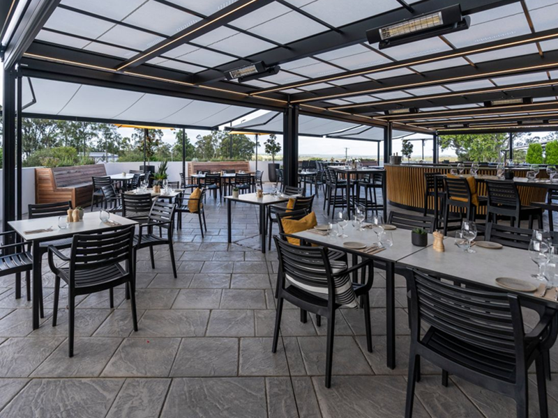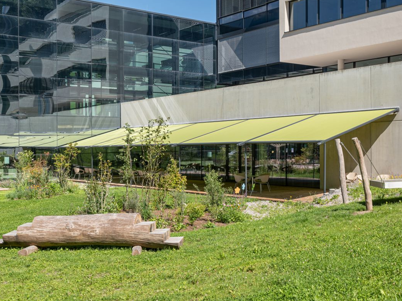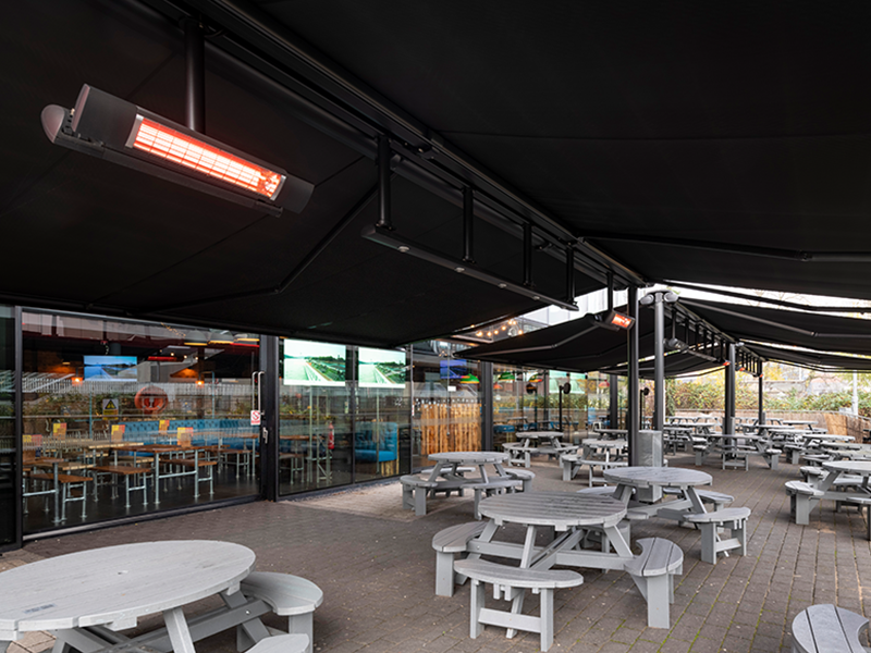 Multiple Markilux Pergola Classic’s with adjustable front supports, allowing rainwater to drain off better, so that the sunshade also becomes a shelter during light rainfall. Sunvas Perla Flame Resistant and Waterproof fabric meeting fire protection regulations for public buildings.