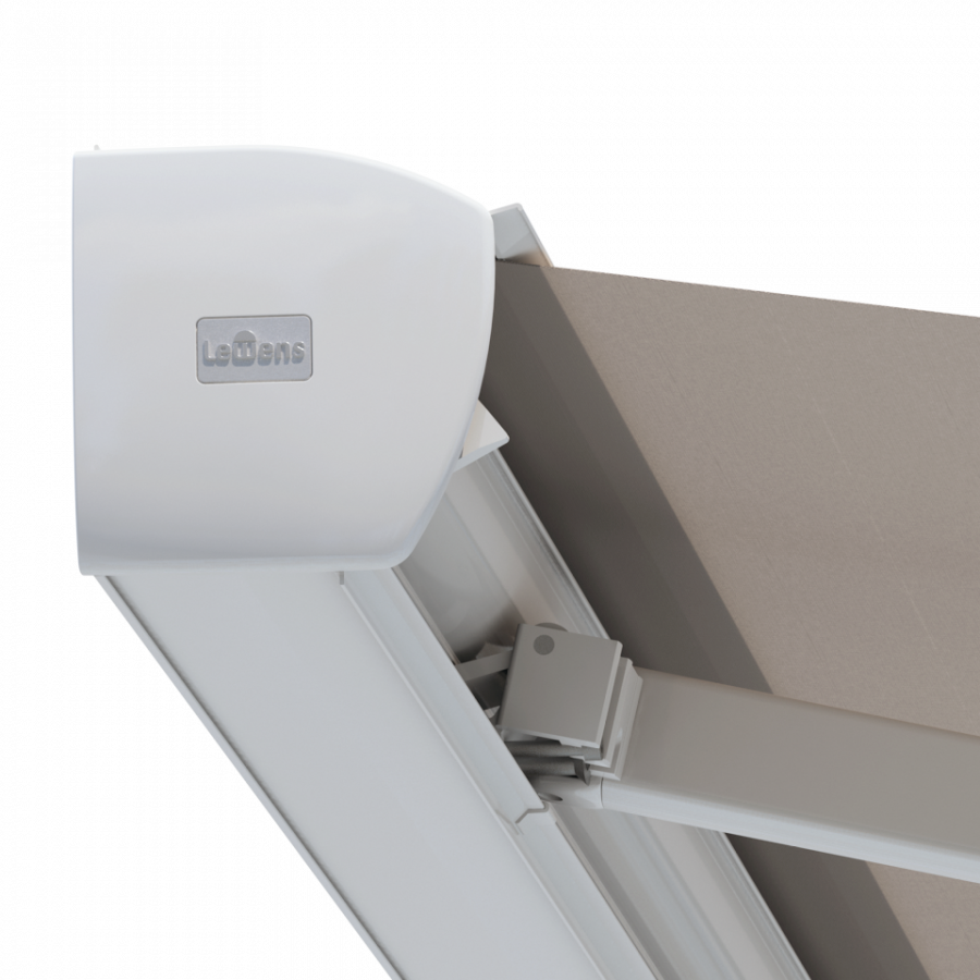 The Family Compact awning system from Lewens is engineered for versatility and performance in compact outdoor spaces. It supports a maximum width of 650 cm as a single-panel unit, or up to 1,950 cm when configured as a linked system with a slit cover across two or three units. The maximum drop reaches 350 cm, making it suitable for a variety of balcony and patio layouts. Operation is available via an electric motor, with a manual hand crank offered as an alternative. A valance can be added as an optional feature. The awning is compatible with a range of high-quality fabrics, including branded acrylic, optional branded polyester, optional recycled polyester, and the water-repellent Orchestra MAX, which is available in sizes up to 600 cm wide and 350 cm deep. Frame finishes include 29 standard Lewens colours, natural silver (E6/EV1 anodized with RAL 9006 components), and a selection of optional RAL special colours and textured effect finishes.