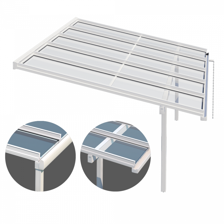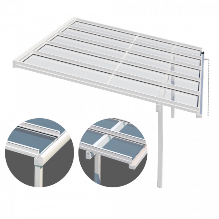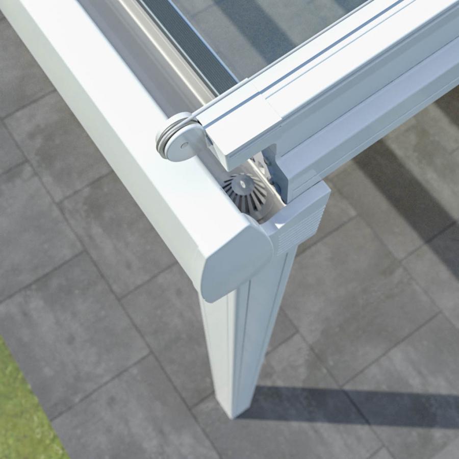 The Murano Vetro glass roof offers year-round protection from the elements, making it the ideal solution for extending the use of your patio in any season. Its sleek, modern design can be installed with ease on most patio structures, and its generous maximum dimensions make it perfectly suited for covering wide outdoor areas. A variety of configurations are available, including models with posts aligned with the front profile or set inward for a more tailored architectural fit.